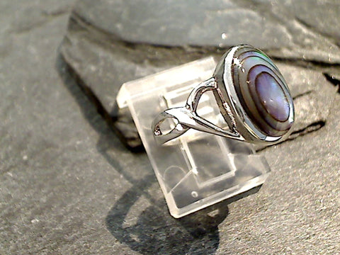 Size 8.75 Abalone and sterling silver ring. The ring is around 1/2" long at the front and the band is just over 2mm at the back. The color and pattern on the stone may vary slightly from the sample photos with each ring.
