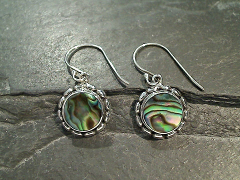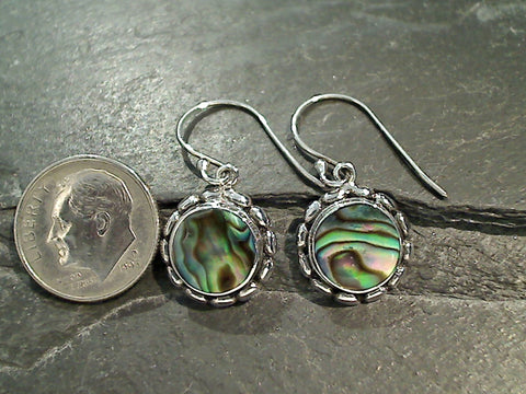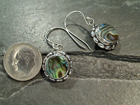 Abalone and sterling silver earrings measure just over 1-1/8" tall with the hooks by just over 1/2" wide at the max points and are light weight. The color and pattern on the stones will vary slightly from the sample photos with each pair. Each pair includes a card about Abalone and comes packaged in a jewelry box.