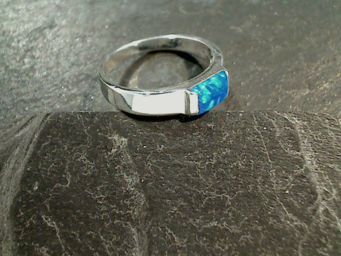Size 5 Lab Created Opal and sterling silver ring. The band is around 2mm at the back and the ring is just over 1/8" tall at the front. The color of the stone is very consistent to the sample photos with each ring. Each ring includes a card about the stone and comes packaged in a jewelry box.
