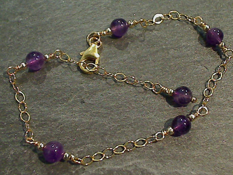 6" to 7" adjustable length Amethyst and 14K gold filled bracelet made by The Mystic Jewel. The Amethyst beads are 4mm round. This bracelet is light weight. The color of the stones is very consistent to the sample photos with each bracelet. Each bracelet includes a card about Amethyst and comes packaged in a jewelry box.