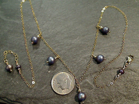 ProductVariantDrop16" to 17" adjustable length pearlescent grey Pearl and 14K gold filled necklace made by The Mystic Jewel. The larger Pearl beads are 6mm (around 1/4") round. This necklace is light weight. The 18" version is shown in the photos. Longer versions have more chain by the clasp and the extender, shorter versions have less chain. The color of the Pearls is very consistent to the sample photos with each necklace. Each necklace includes a card about Pearl and comes packaged in a jewelry box.