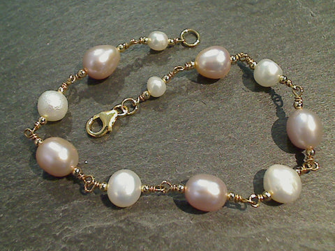 7.5" white and blush Pearl and 14K gold filled bracelet made by The Mystic Jewel. The Pearl beads range in size from 4mm to 7mm. This bracelet is light to mid weight. Get the exact bracelet shown in the photos! This bracelet includes a card about Pearl and comes packaged in a jewelry box.