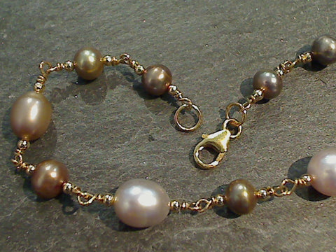 7.25" multi-color Pearl and 14K gold filled bracelet made by The Mystic Jewel. The Pearl beads range in size from 5mm to 7mm. This bracelet is light to mid weight. Get the exact bracelet shown in the photos! This bracelet includes a card about Pearl and comes packaged in a jewelry box.