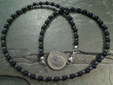 16" Onyx and Hematite beaded necklace with sterling silver clasp and ends made by The Mystic Jewel. The Onyx beads are 4mm round and the Hematite beads are 3mm round. Wear this necklace by itself or use it to put a pendant on. The pendant must have a somewhat large bail to fit over the beads. The color of the beads is very consistent to the sample photos with each necklace. Each necklace includes a card about each stone and comes packaged in a jewelry box.