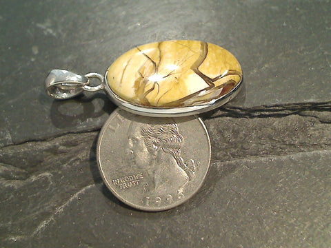 Brecciated Mookaite Jasper and sterling silver mid to slightly larger size pendant measures just under 1-3/4" tall with the bail by around 7/8" wide and is mid weight. We suggest a medium gauge chain with this pendant. Get the exact pendant shown in the photos! This pendant includes a card about Jasper and comes packaged in a jewelry box.