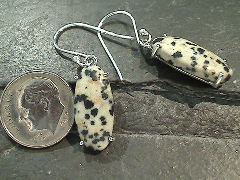 Dalmatian Jasper sterling silver earrings measure 1-3/8" tall with the hooks by 3/8" wide at the max points and are light to mid weight. The color and pattern on the stones may vary slightly from the sample photos with each pair. Each pair includes a card about Jasper and comes packaged in a jewelry box.
