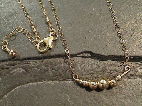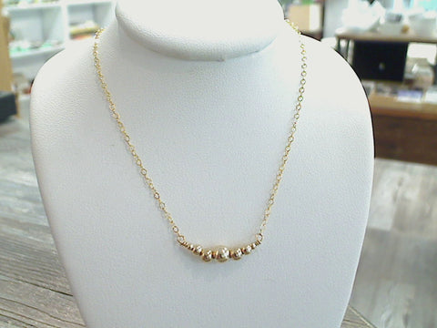 14" to 15" adjustable length 14K gold filled 7 beads necklace made by The Mystic Jewel. The centerpiece is made up of 7 beads on a curved wire. The center bead is 5mm round with a 4mm, 3mm and 2mm bead on each side. The necklace is light weight. Each necklace comes packaged in a jewelry box.