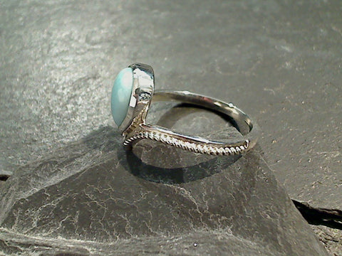Size 6 Larimar and sterling silver ring. The band measures around 2mm at the back and the ring is around 1/2" tall at the front. The color of the stone may vary slightly from the sample photos with each ring. Each ring comes packaged in a jewelry box and includes a card about Larimar.