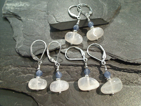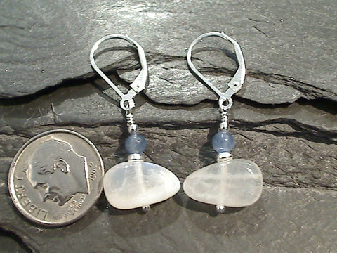 Moonstone, Kyanite and sterling silver earrings made by The Mystic Jewel measure around 1-3/8" tall with the lever back hooks by 1/2" to 5/8" wide at the max points and are light weight. The exact shape of the Moonstone, the exact measurements and the color flash in the Moonstone will vary slightly with each pair, as shown in the sample photos. Each pair includes a card about each stone and comes packaged in a jewelry box. Price is for one pair.