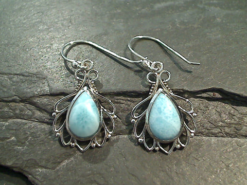 Larimar and sterling silver earrings measure 1-3/8" tall with the hooks by 5/8" wide at the max points and are light to mid weight. Get the exact pair shown in the photos! This pair includes a card about Larimar and comes packaged in a jewelry box.