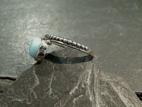 Size 7 Larimar and sterling silver ring. The band measures around 2mm at the back and the ring is around 3/8" tall at the front. The color of the stone may vary slightly from the sample photos with each ring. Each ring comes packaged in a jewelry box and includes a card about Larimar.