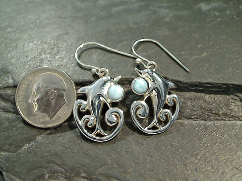 Larimar and sterling silver dolphin earrings measure just over 1-1/4" tall with the hooks by just over 1/2" wide at the max points and are light to mid weight. The color and pattern on the Larimar will vary slightly from the sample photos with each pair. Each pair includes a card about Larimar and comes packaged in a jewelry box.