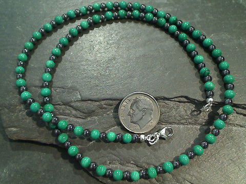 18.5" Malachite and Hematite beaded necklace with sterling silver clasp and ends made by The Mystic Jewel. The Malachite beads are 4mm round and the Hematite beads are 3mm round. Wear this necklace by itself or use it to put a pendant on. The pendant must have a somewhat large bail to fit over the beads. The color of the stones is very consistent to the sample photos with each necklace. Each necklace includes a card about each stone and comes packaged in a jewelry box.