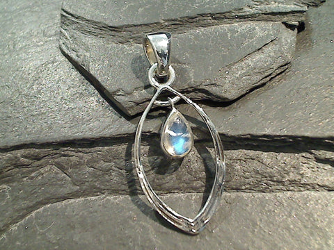Moonstone and sterling silver mid size pendant measures 1-1/2" tall with the bail by 5/8" wide and is light weight. We suggest a thin gauge chain with this pendant. The color flash in the stone will vary with each pendant. Each pendant includes a card about Moonstone and comes packaged in a jewelry box.