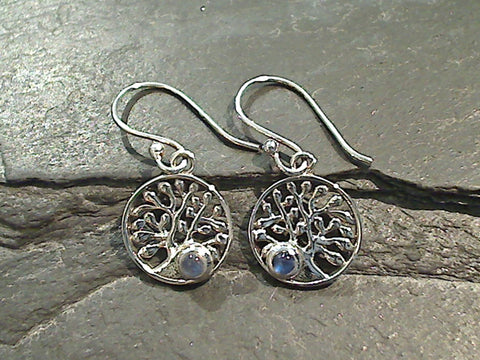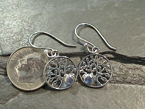 Moonstone and sterling silver small tree of life earrings measure 1-1/8" tall with the hooks by just over 1/2" wide at the max points and are light weight. The color of the stones may vary slightly from the sample photos with each pair. Each pair includes a card about Moonstone and comes packaged in a jewelry box.
