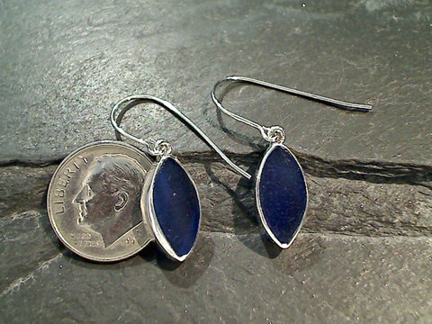 Blue sea glass and sterling silver earrings by Mystical Madness measure just over 1-1/8" tall with the hooks by 5/16" wide at the max points and are light weight. The color of the sea glass may vary slightly from the sample photos with each pair. Each pair includes a card about sea glass and comes packaged in a jewelry box.