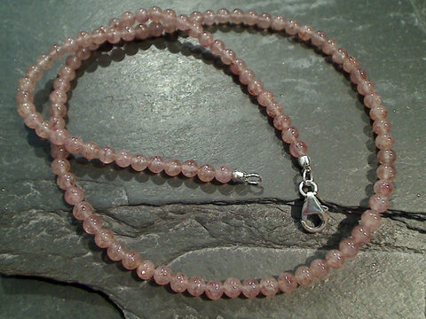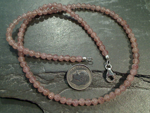 17" Cherry Quartz 4mm beaded necklace with sterling silver clasp and ends made by The Mystic Jewel. The beads are 4mm round. Wear this necklace by itself or use it to put a pendant on. The pendant must have a somewhat large bail to fit over the beads. The color of the beads is very consistent to the sample photos with each necklace. Each necklace includes a card about Quartz and comes packaged in a jewelry box.