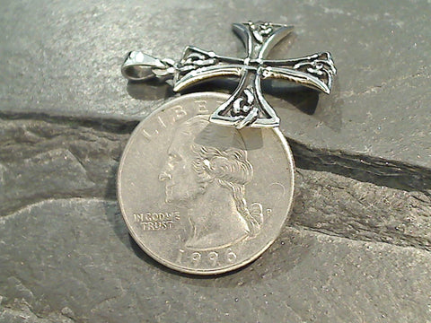Sterling silver mid size Celtic style cross pendant measures just over 1-1/8" tall with the bail by 7/8" wide at the max points and is light to mid weight. We suggest a thin or medium gauge chain with this pendant. Each pendant comes packaged in a jewelry box.