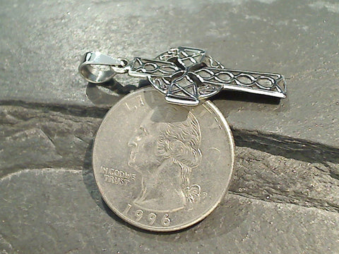 Sterling silver mid size Celtic style cross pendant measures 1-3/8" tall with the bail by 5/8" wide at the max points and is light weight. We suggest a thin gauge chain with this pendant. Each pendant comes packaged in a jewelry box.