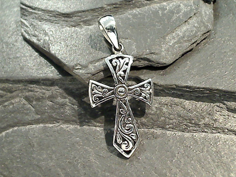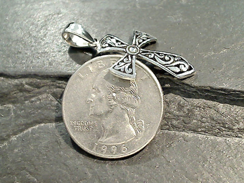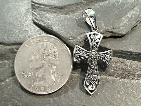 Sterling silver small to mid size cross pendant measures just over 1-1/4" tall with the bail by 5/8" wide at the max points and is light weight. We suggest a thin gauge chain with this pendant. Each pendant comes packaged in a jewelry box.
