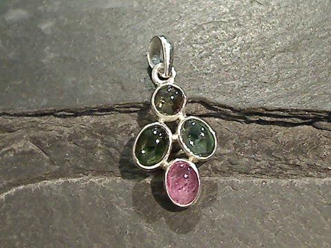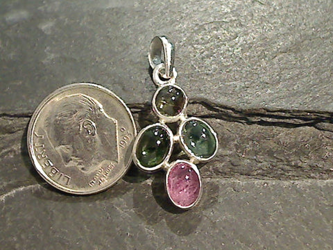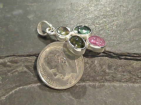 Multi-color Tourmaline and sterling silver small size pendant measures just under 1-1/8" tall with the bail by just over 1/2" wide at the max points and is light weight. We suggest a thin gauge chain with this pendant. Get the exact pendant shown in the photos! This pendant includes a card about Tourmaline and comes packaged in a jewelry box.