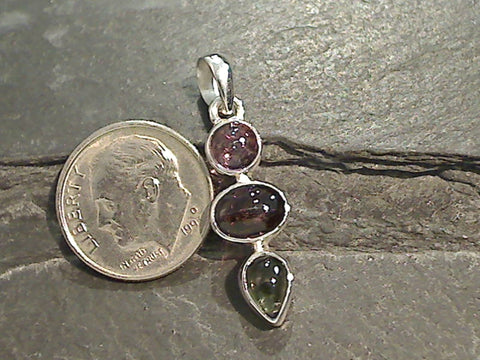 Multi-color Tourmaline and sterling silver small size pendant measures just over 1-1/8" tall with the bail by just over 5/16" wide at the max points and is light weight. We suggest a thin gauge chain with this pendant. Get the exact pendant shown in the photos! This pendant includes a card about Tourmaline and comes packaged in a jewelry box.