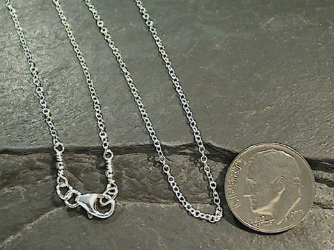 18" thin gauge 1mm cable chain. The chain is thin and light weight and can be used for light weight or mid weight pendants. The chain is shown with some pendants of varying sizes in the sample photos to give an idea of how it will look with different pendant sizes. Each chain comes packaged in a jewelry box.