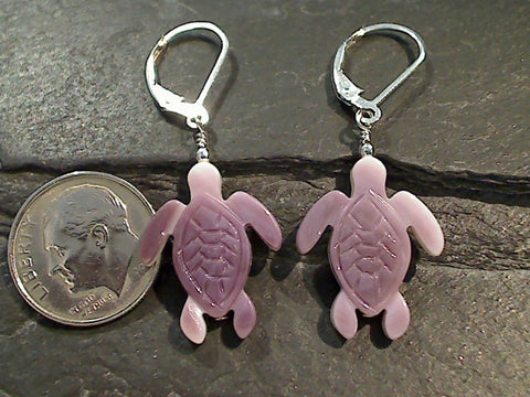 Purple and white carved shell and sterling silver sea turtle earrings made by The Mystic Jewel measure around 1-1/2" tall with the lever back hooks by 5/8" wide at the max points and are light weight. The shells are carved on both sides and are white on the back side. You can rotate the turtle to make the white back side show instead of the purple front. The color of the shells may vary slightly from the sample photos with each pair. Each pair comes packaged in a jewelry box.
