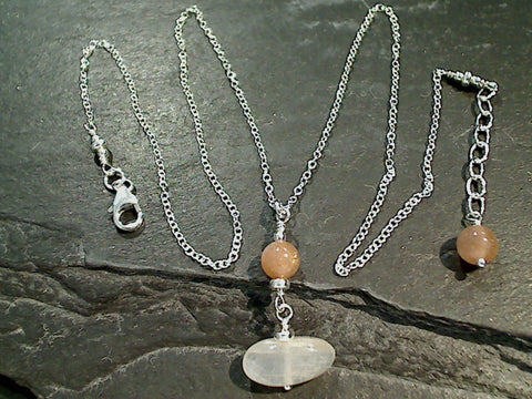 16" to 17" adjustable length Peach and Rainbow Moonstone and sterling silver necklace. The centerpiece measures around 1-1/4" tall by around 1/2" wide. The necklace is light weight. The photos show the 16" version of the necklace. The longer versions of this necklace have more chain. The color of the stones is very consistent to the sample photos with each necklace. The exact shape of the white Rainbow Moonstone will vary slightly with each necklace. Each necklace includes a card about Moonstone and comes packaged in a jewelry box.