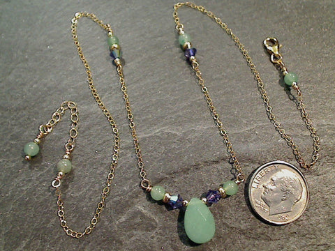 18.5" to 19.5" adjustable length Green Aventurine, Purple Swarovski Crystal and 14K gold filled necklace made by The Mystic Jewel. The center tear drop shaped bead is 1/2" tall and the entire beaded centerpiece is 1-1/8" wide. This necklace is light weight. The 16" version is shown in the photos. Longer versions have more chain by the clasp and the extender. The color of the stones is very consistent to the sample photos with each necklace. Each necklace includes a card about Aventurine and comes packaged in a jewelry box.