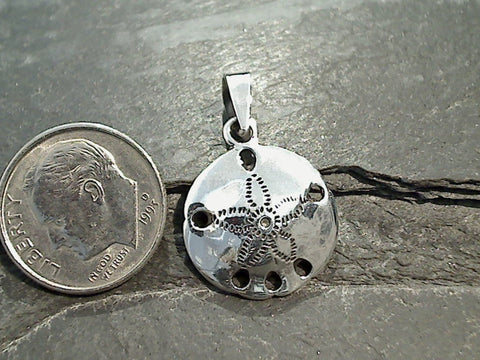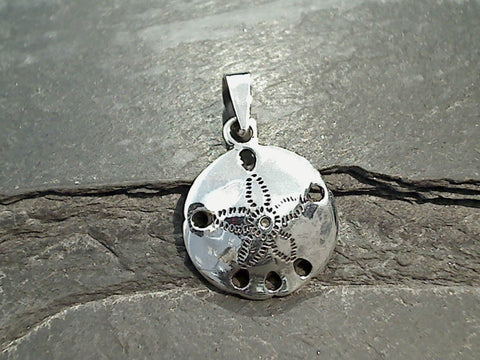 Sterling silver sand dollar pendant measures 1" tall with the bail by just over 5/8" wide at the max points and is light weight. We suggest a thin gauge chain with this pendant. Each pendant comes packaged in a jewelry box.