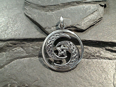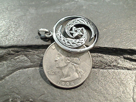Sterling silver mid size Celtic moons pendant measures 1-1/4" tall with the bail by just under 1" wide at the max points and is light to mid weight. We suggest a thin or medium gauge chain with this pendant. Each pendant comes packaged in a jewelry box.