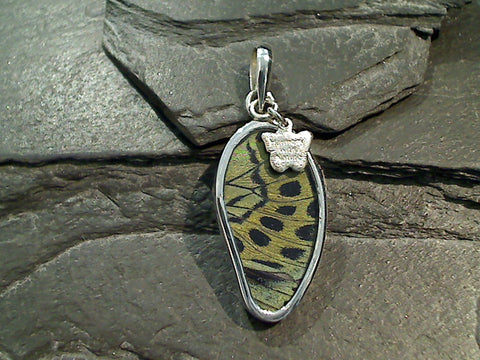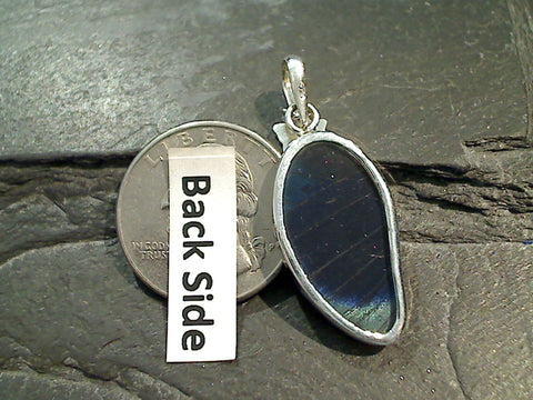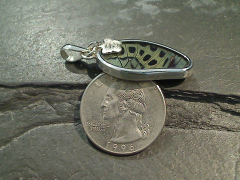 Genuine butterfly wing (SPECIES: Calithea) and sterling silver pendant measures 1-1/2" tall with the bail by 5/8" wide at the max points and is light weight. We suggest a thin or medium gauge chain with this pendant. The wing is covered in glass on the front and the back. There is a different pattern on the back side, shown in the photos. GET THE EXACT PENDANT SHOWN IN THE PHOTOS! This is an actual butterfly wing collected from tropical butterfly farms where they live out their natural lives, typically 3 to 20 days depending on the species. Do not submerge in water and avoid long term exposure to direct sunlight as this may cause the colors to fade. Each pendant includes a card about Butterfly Wings and comes packaged in a jewelry box.