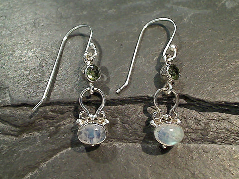Moonstone, Peridot and sterling silver earrings measure 1-1/2" tall with the hooks by just under 3/8" wide at the max points and are light weight. The color flash in the Moonstone will vary slightly from the sample photos with each pair. Each pair includes a card about each stone and comes packaged in a jewelry box.