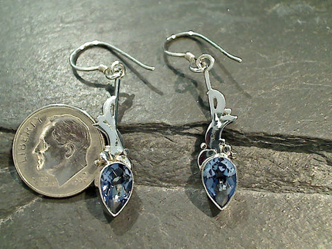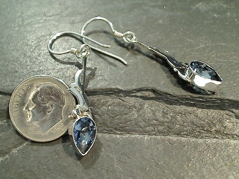 Blue Quartz and sterling silver earrings measure just under 1-3/4" tall with the hooks by just over 1/4" wide at the max points and are light weight. The color of the stones may vary slightly from the sample photos with each pair. Each pair includes a card about Blue Quartz and comes packaged in a jewelry box.
