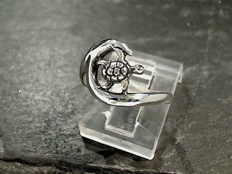 Size 5.75 sterling silver wave and sea turtle ring. The band measures just under 2mm at the back and the ring is just under 1/2" long at the front. Each ring comes packaged in a jewelry box.