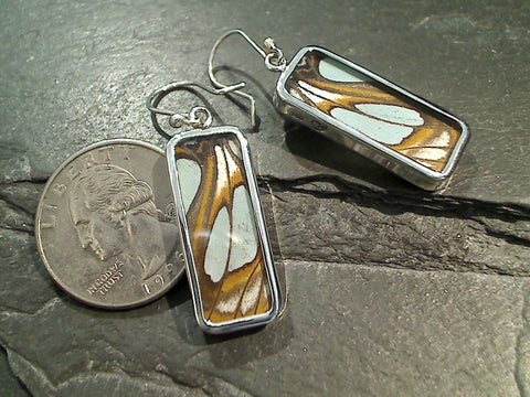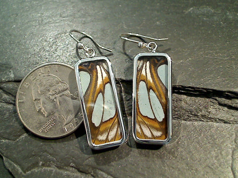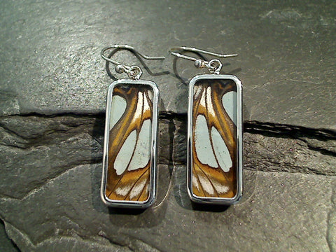 ProductVariantDropGenuine butterfly wings (SPECIES: Stelenes) and sterling silver earrings measure just under 1-3/4" tall with the hooks by just under 1/2" wide at the max points and are light to mid weight. The wings are covered in glass on the front and the back. There is a different pattern on the back side, shown in the photos. GET THE EXACT PAIR SHOWN IN THE PHOTOS! These are actual butterfly wings collected from tropical butterfly farms where they live out their natural lives, typically 3 to 20 days depending on the species. Do not submerge in water and avoid long term exposure to direct sunlight as this may cause the colors to fade. Each pair includes a card about Butterfly Wings and comes packaged in a jewelry box.