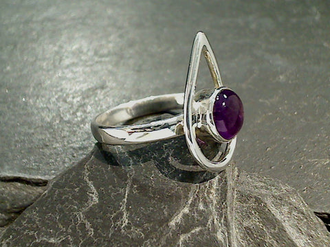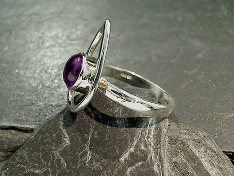 Size 8 Amethyst and sterling silver ring. The band measures around 3mm at the back and the ring is just over 3/4" tall at the front. The color of the stone may vary slightly from the sample photos with each ring. Each ring comes packaged in a jewelry box and includes a card about Amethyst.