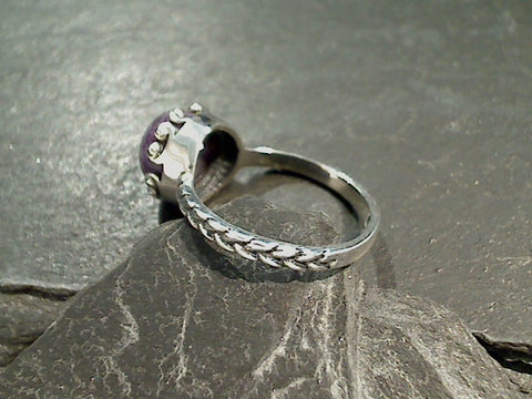 Size 8 Charoite and sterling silver ring. The band measures around 2mm at the back and the ring is just over 3/8" tall at the front. The color of the stone may vary slightly from the sample photos with each ring. Each ring comes packaged in a jewelry box and includes a card about Charoite.