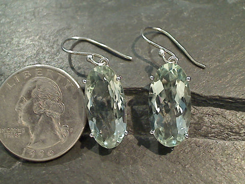 Green Amethyst and sterling silver earrings measure 1-3/8" tall with the hooks by 3/8" wide at the max points and are mid weight. The color of the stones is very consistent to the sample photos with each pair. Each pair includes a card about Green Amethyst and comes packaged in a jewelry box.