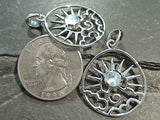 Moonstone and sterling silver sun pendant measures 1-1/4" tall with the bail by just under 1" wide at the max points and is light weight. We suggest a thin gauge chain with this pendant. The color of the stone is very consistent to the sample photos with each pendant. Price is for one pendant. Each pendant includes a card about Moonstone and comes packaged in a jewelry box.