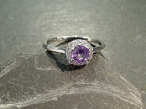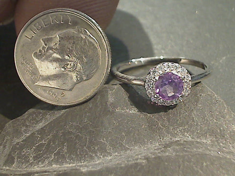 Size 9 Amethyst, Cubic Zirconia and sterling silver ring. The ring is 5/16" long at the front. The band is around 1mm. The color of the Amethyst may vary slightly from the sample photos with each ring. Each ring includes a card about Amethyst and comes packaged in a jewelry box.